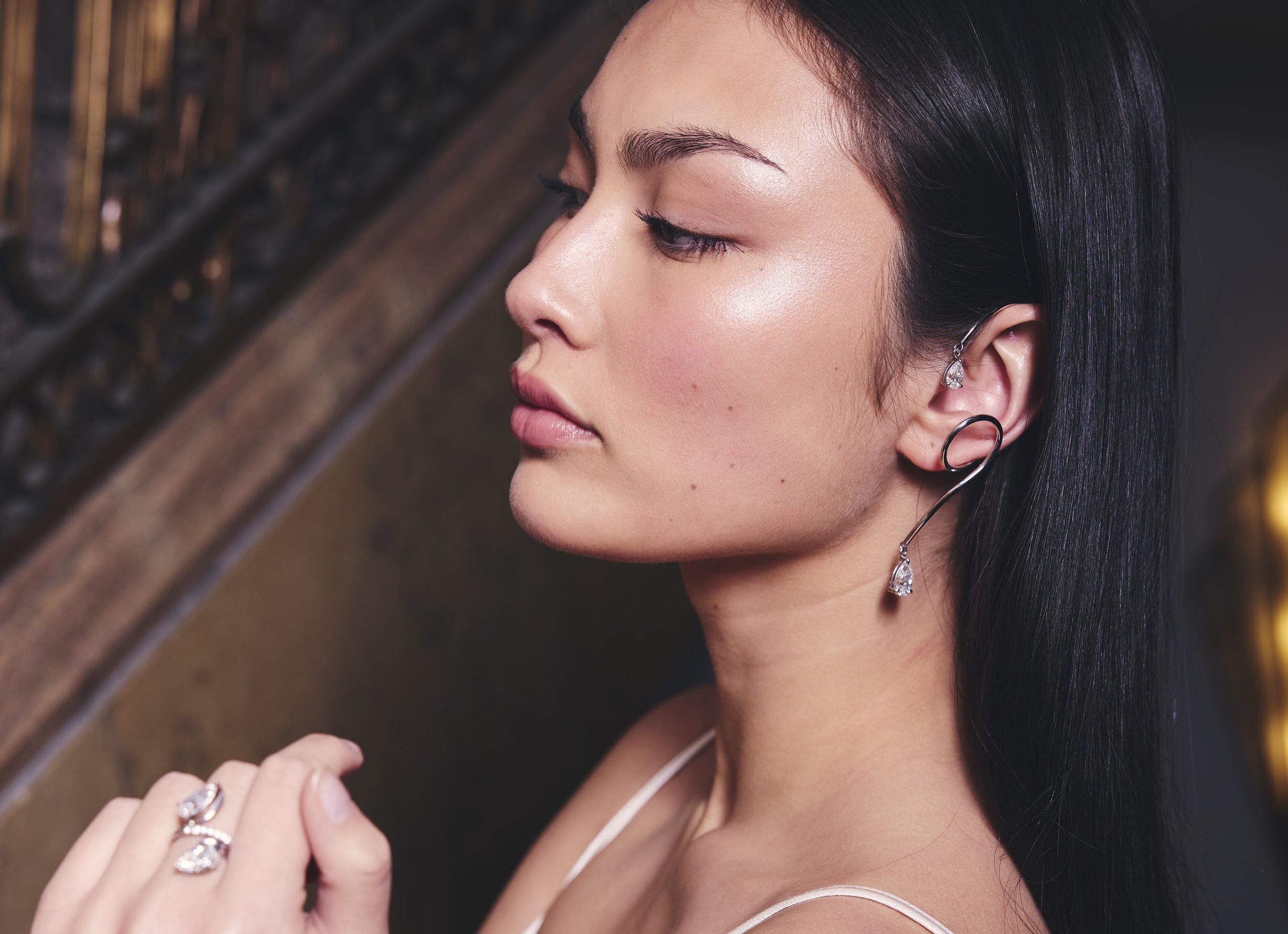 Loop ear cuff featuring pear cut diamonds set at the top and bottom ends of the looped design.