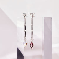 Featuring a trail of entirely custom cut diamonds, in trilliant, baguette, tapered baguette, trapezoid shapes, paired with a custom pear step cut diamond on one earring, and a custom lozenge cut pink tourmaline on the other. Each piece is bezel set in platinum, delicately hinged at each joint to form a chain of precious stones for each drop earring.