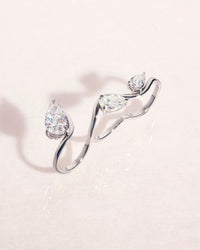 18ct white gold three-finger ring with pear cut diamonds on a light pink background